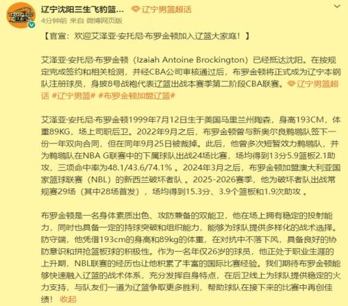 北京時(shí)間3月6日上午9點(diǎn),遼籃正式官宣與新援布羅金頓簽約。那么也就意味著,布羅金頓將從第二階段開始,代表遼籃打完本賽季剩余的所有比賽。