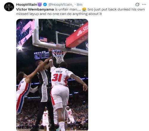 這場比賽文班亞馬又打出了炸裂的表現(xiàn),在一次挑籃沒有命中后,他面對兩人直接補扣成功,文班亞馬這個身體天賦實在是太強悍了。首節(jié)6中4+三分3中2拿到12分3籃板3蓋帽。