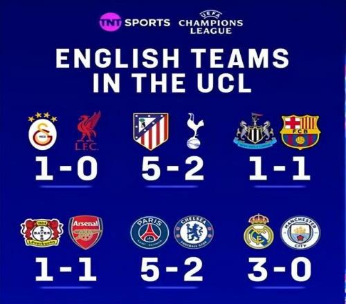 先來看歐冠賽場,利物浦0-1爆冷輸給加拉塔薩雷、熱刺2-5慘敗不敵馬競、紐卡1-1遭巴薩絕平、阿森納1-1絕平勒沃庫森、切爾西2-5慘敗輸給巴黎、曼城0-3遭皇馬橫掃。