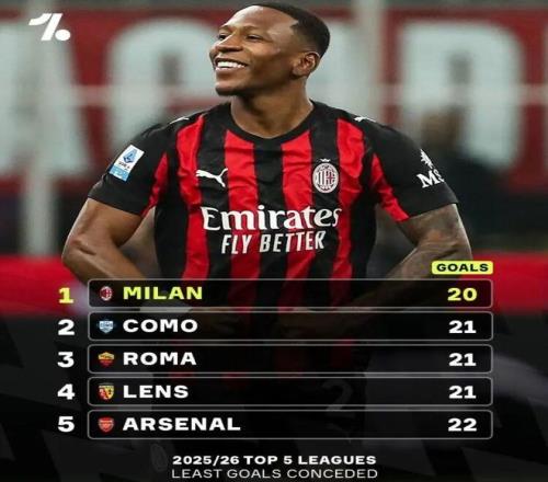 根據(jù)數(shù)據(jù)統(tǒng)計,米蘭是本賽季五大聯(lián)賽迄今為止丟球最少的球隊,紅黑軍團僅丟了20球,位居其后的是科莫、羅馬及朗斯的21球,阿森納以22球位居第5。