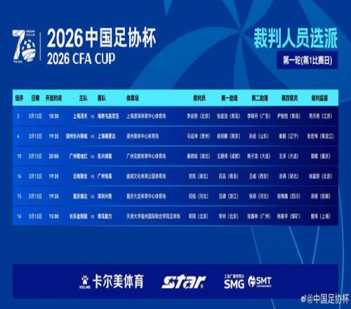 3月13日,2026中國足協(xié)杯迎來首輪首個比賽日。賽前,中國足協(xié)發(fā)布了首日6場比賽的裁判人員選派安排表。