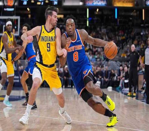 尼克斯上一場(chǎng)客場(chǎng)134-117戰(zhàn)勝爵士,步行者過(guò)去11場(chǎng)遭遇11連敗位列聯(lián)盟倒數(shù)第一,本賽季前兩次交鋒雙方各取一勝。本場(chǎng)尼克斯缺少唐斯、哈特、索漢、麥克布萊德,步行者缺少哈利伯頓、西亞卡姆。首節(jié)前5分鐘雙方纏斗至8-8,尼克斯內(nèi)外開花一波9-0攻勢(shì)取得領(lǐng)先,托平三分追分。布倫森中投得分,步行者連追5分,尼克斯維持微弱領(lǐng)先優(yōu)勢(shì),首節(jié)比賽結(jié)束尼克斯24-21領(lǐng)先步行者。首節(jié)步行者三分11中3,尼克斯三分6中1,布倫森9中5得到11分。