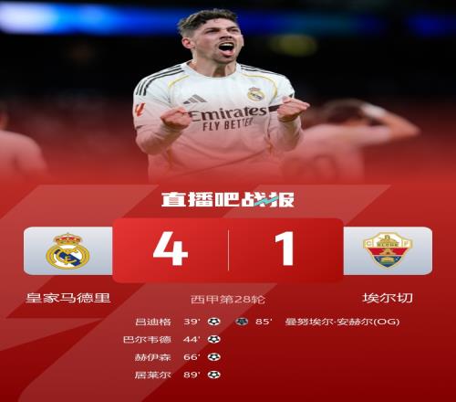 皇馬4-1擊敗埃爾切,本輪皇馬先賽暫落后榜首1分。 本場巴爾韋德再度破門,居萊爾上演驚天吊射。