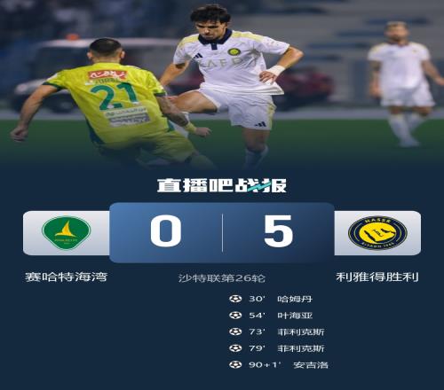 利雅得勝利5-0大勝賽哈特海灣,豪取沙特聯(lián)12連勝。