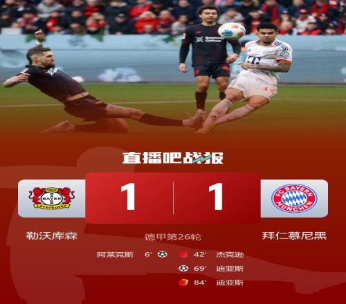 拜仁1-1勒沃庫森,各項賽事七連勝終結(jié),9分優(yōu)勢領(lǐng)跑積分榜。本場拜仁杰克遜、迪亞斯染紅。