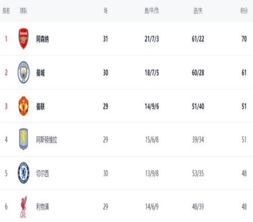 在積分榜上,阿森納以70分高居榜首。曼城掉鏈子,總積分只有61分,排名第2。曼城落后9分之多。顯然,英超冠軍歸屬已經(jīng)基本失去懸念。曼城爭冠只存在理論上的可能性。曼聯(lián)51分,排名第3。第4的阿斯頓維拉也是51分。切爾西輸球,依然是48分,排名第5。利物浦比切爾西少賽一場,也是48分,排名第6。熱刺只拿到29分,排名第16。
