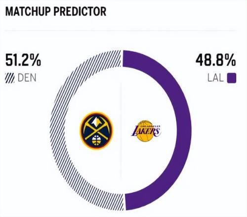 賽前,美媒ESPN對(duì)本場(chǎng)比賽進(jìn)行了勝率預(yù)測(cè),湖人隊(duì)勝率48.8% ,掘金勝率則為51.2% ,算是半斤八兩 。