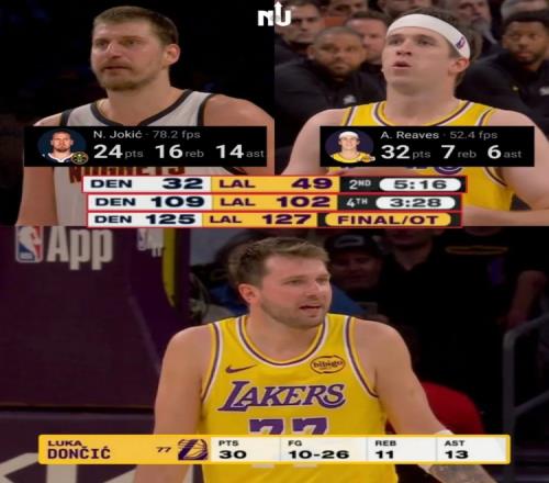 湖人一度領先到17分,但約基奇看破湖人策略,找布魯斯·布朗,找底角的瓊斯,連續(xù)追近。湖人則是盧卡與里夫斯輪流找穆雷。
