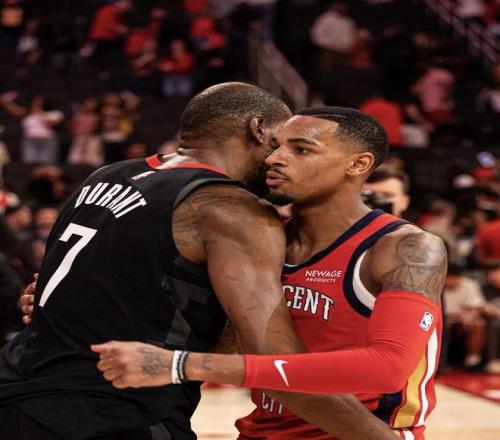 值得一提的是,在對陣火箭賽后,鵜鶘官方曬出了德章泰穆雷與杜蘭特的合照,并且寫道:“排除萬難的兩個人!”