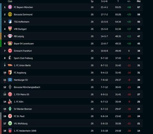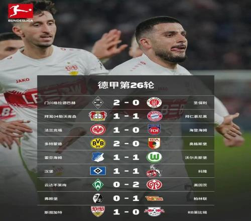 隨著北京時(shí)間3月16日凌晨進(jìn)行的歐冠席位的關(guān)鍵爭(zhēng)奪戰(zhàn)中,斯圖加特1比0力克萊比錫,德甲第26輪全部比賽全部結(jié)束。被罰下2人的拜仁慕尼黑,在客場(chǎng)1比1艱難逼平勒沃庫(kù)森;而多特蒙德2比0擊退前來(lái)造訪的奧格斯堡,將與拜仁的分差縮小至9分;霍芬海姆戰(zhàn)平沃爾夫斯堡后積50分,而斯圖加特贏球后積分也來(lái)到了50分,因凈勝球劣勢(shì)屈居第四;RB萊比錫積47分排名第五,勒沃庫(kù)森積45分,本輪遺憾錯(cuò)失了反超萊比錫的機(jī)會(huì)。