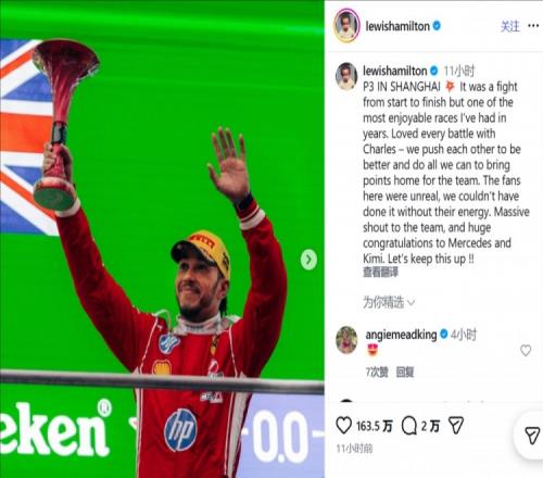 體育播報(bào)3月16日宣 F1中國(guó)站落下帷幕,法拉利車手漢密爾頓獲得第三名,他賽后在社交媒體上感謝了中國(guó)車迷。