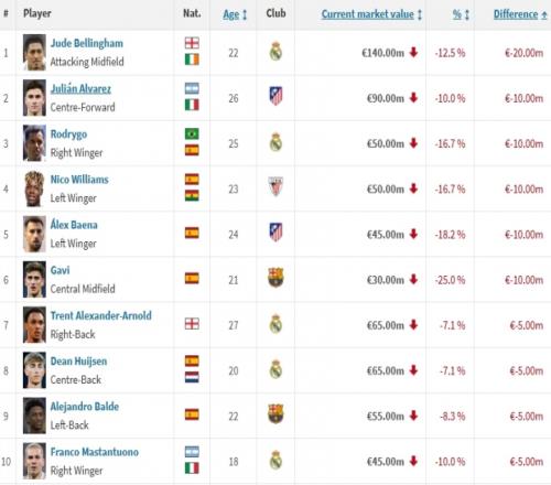 西甲身價跌幅榜:貝林跌2000萬居首,小蜘蛛、羅德里戈跌1000萬