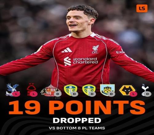 根據(jù)數(shù)據(jù)機(jī)構(gòu)記錄,本賽季利物浦對(duì)英超聯(lián)賽后八名球隊(duì)丟了19分。這個(gè)成績(jī)跟他們昔日的斗志、不服輸?shù)谋荣愄厣孟喾础?jù)悉,斯洛特輸給過(guò)水晶宮、諾丁漢森林和狼隊(duì),戰(zhàn)平過(guò)桑德蘭、利茲聯(lián)(2次)、伯恩利和熱刺的,的確是送分太多。