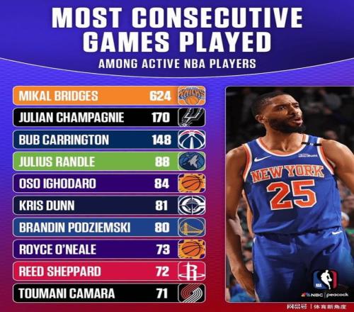 對比之下,現(xiàn)役連續(xù)出場場次排名第二的馬刺新星尚帕尼,也70場,而布里奇斯則是他的近四倍之多。接下來的排名,巴布-卡林頓148場、蘭德爾88場……直至圖馬尼-卡馬拉的71場,這些數(shù)字在布里奇斯的624場面前,都顯得黯然失色。
