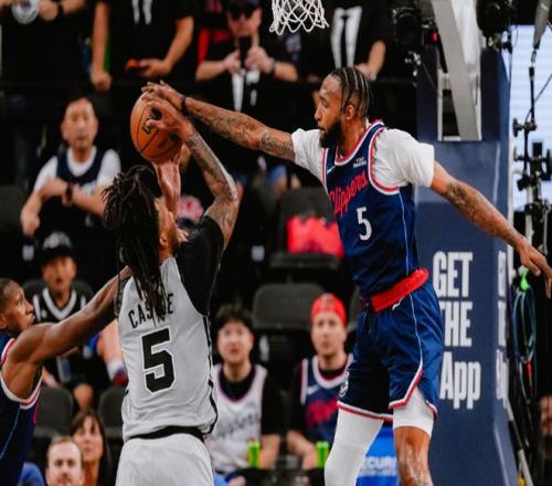 進(jìn)入第四節(jié)比賽,文班亞馬暴扣擴(kuò)大12分優(yōu)勢,快船內(nèi)外開花一波9-4攻勢追分,馬刺被追到僅100-93領(lǐng)先7分。布萊恩特造加蘭三分犯規(guī)三罰全中,科林斯與米勒接連得分打停馬刺,巴恩斯三分回敬。快船連得4分追到僅差6分打停馬刺,瓦塞爾中投與助攻卡斯?fàn)柸置?,??怂挂矑伾涞梅謹(jǐn)U大115-102領(lǐng)先優(yōu)勢。加蘭3+1與米勒上籃繼續(xù)追分續(xù)命,馬刺打鐵不中,加蘭再中三分追到僅差4分,馬刺再度請求暫停??齑舆B兩次犯規(guī)后快船挑戰(zhàn)失敗,瓦塞爾兩罰全中擴(kuò)大6分優(yōu)勢,文班亞馬大帽加蘭,米勒上籃命中。福克斯被犯規(guī)兩罰全中,加蘭繼續(xù)上籃命中,文班亞馬兩罰不中,快船未能完成大逆轉(zhuǎn),最終馬刺險勝快船達(dá)成賽季第50勝。