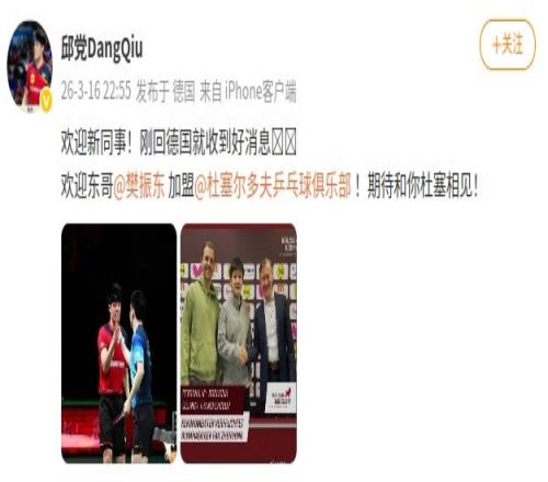 邱黨歡迎樊振東:歡迎東哥加盟杜塞爾多夫!期待和你杜塞相見!