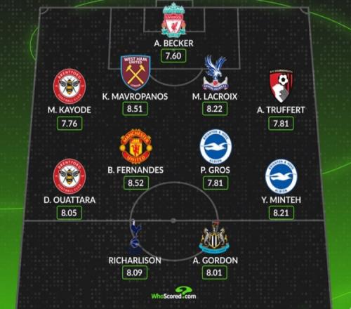 WhoScored英超第30輪最佳陣容:B費(fèi)、戈登、里沙利松、阿利松在列