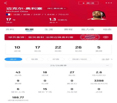 24歲的奧利塞本賽季為拜仁出戰(zhàn)43場(chǎng)比賽,貢獻(xiàn)18球27助,現(xiàn)身價(jià)1.3億歐。