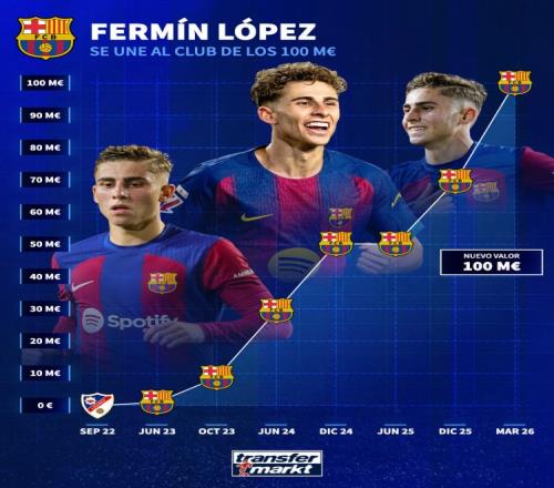 體育播報(bào)3月17日宣 德國(guó)轉(zhuǎn)會(huì)市場(chǎng)更新社媒動(dòng)態(tài),曬出了巴薩中場(chǎng)費(fèi)爾明身價(jià)變化圖。