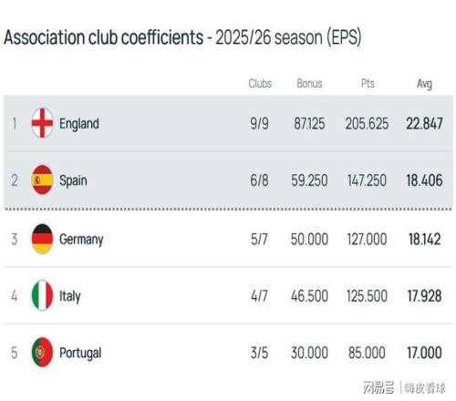 除了英超之外,西甲、德甲和意甲分別排在第二名到第四名,首尾差距不到0.5分,只要比其他聯(lián)賽多一隊晉級下一個階段,就能抹平這個差距。誰能獲得另外一個歐冠獎勵名額,還是有些懸念的,三大聯(lián)賽將會為前兩名展開激烈的爭奪。
