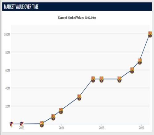 2023年初,費爾明的身價為10萬歐元;2023年夏天,費爾明進入巴薩一線隊,到10月份,完成巴薩首秀的費爾明,身價漲到800萬。在巴薩站穩(wěn)腳跟之后,費爾明的身價不斷攀升,1500萬、3000萬、5000萬……去年10月,費爾明身價漲到6000萬,12月達到7000萬,最新一期飆升至1億!