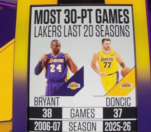 東契奇本賽季已經(jīng)拿到第37次30+,過去20個賽季,僅次于科比06-07賽季的38次(05-06賽季的科比有56次30+是湖人隊史紀(jì)錄),東契奇本賽季場均32.9分也是聯(lián)盟的得分王,他將成為科比后湖人隊史又一位得分王。