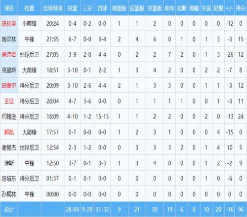 本場比賽,無論在外援還是國內(nèi)球員的對比上,山東隊均處于劣勢。約翰遜得到山東隊最高分24分,但10投只有4中,有15分來自罰球。陶漢林發(fā)揮出老將作用,得到15分6籃板。珀塞爾10中3,得到12分。高詩巖9中3,得到12分,正負值低至負26。王證三分球6中3,得到11分,且正負值只有負3,成為山東隊為數(shù)不多的亮點之一。值得一提的是,山東隊全隊96分鐘,有三成(31分)來自罰球,進攻流暢性可見一斑。