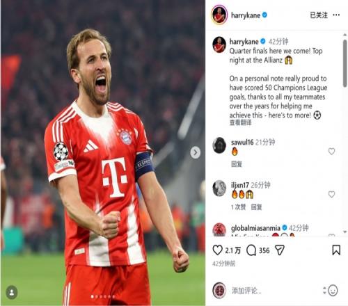 凱恩社媒曬出慶祝進(jìn)球的照片,配文:“四分之一決賽,我們來(lái)了!安聯(lián)球場(chǎng)的精彩夜晚!”