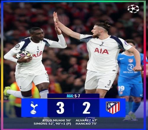 第30分鐘穆阿尼的進(jìn)球幫助熱刺取得領(lǐng)先。馬競在第47分鐘由阿爾瓦雷斯勁射扳平比分。第52分鐘哈維-西蒙斯的進(jìn)球,讓熱刺再度取得領(lǐng)先。第75分鐘漢茨科接角球頭球破門再次追平。第89分鐘西蒙斯點(diǎn)射梅開二度,熱刺3-2贏下本場比賽,但是由于首回合大比分失利,熱刺最終5-7遭到了馬競淘汰。