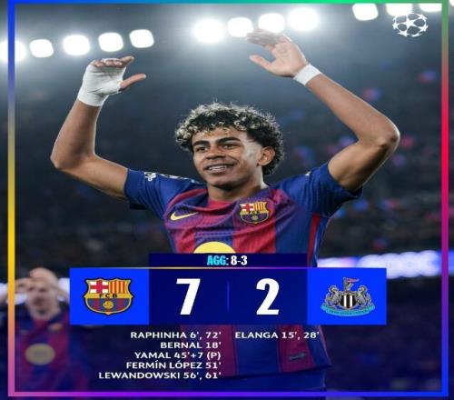 上半場比賽拉菲尼亞和貝爾納爾兩次幫助巴薩取得領(lǐng)先,伊蘭加兩次幫助紐卡扳平。半場補(bǔ)時亞馬爾點(diǎn)射命中,巴薩3-2取得領(lǐng)先。下半場巴塞羅那火力全開,費(fèi)爾明破門,萊萬梅開二度,拉菲尼亞錦上添花,最終7-2贏下勝利,兩回合8-3將對手淘汰出局。