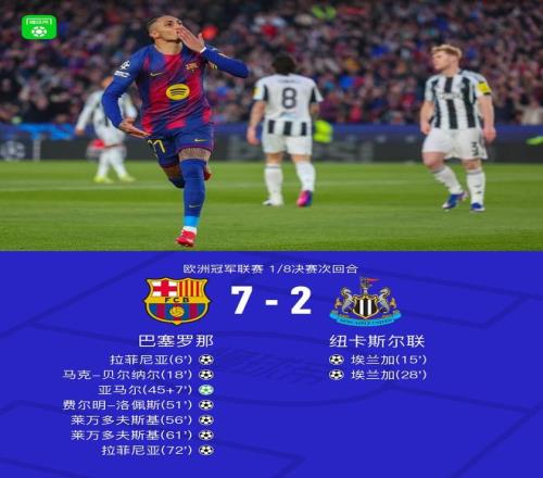 北京時(shí)間3月19日1:45,歐冠1/8決賽次回合,巴塞羅那坐鎮(zhèn)Spotify諾坎普球場迎戰(zhàn)紐卡斯?fàn)柭?lián),本場主裁判為勒泰西耶,首回合雙方1-1戰(zhàn)平。上半場,兩隊(duì)上演進(jìn)球大戰(zhàn),巴薩這邊拉菲尼亞破門+造點(diǎn),貝爾納爾、亞馬爾建功,紐卡方面埃蘭加梅開二度。下半場,費(fèi)爾明破門,萊萬連下兩城梅開二度,拉菲尼亞兩送助攻后再入一球,托納利、霍安-加西亞傷退。最終,巴薩主場7-2狂勝紐卡,總比分8-3晉級(jí)。