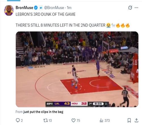 湖媒:上半場詹姆斯已經(jīng)完成了4次暴扣,41歲的勒布朗又火了。