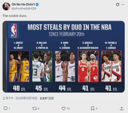 北京時(shí)間3月19日,美媒曬出一組數(shù)據(jù),最近一個(gè)月NBA搶斷最多的二人組:湖人東契奇和斯瑪特合計(jì)48次搶斷,高居聯(lián)盟第一;雄鹿羅林斯和小凱文-波特合計(jì)45次搶斷,聯(lián)盟第二;快船倫納德和鄧恩合計(jì)44次搶斷,聯(lián)盟第三。
