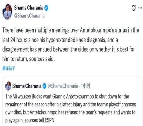 北京時間3月19日,據(jù)名記Shams報道,在字母哥再度受傷、球隊季后賽希望愈發(fā)渺茫之后,雄鹿希望他直接缺席本賽季剩余所有比賽,但這位兩屆MVP拒絕了球隊的要求,堅持想要復(fù)出參賽。過去24小時內(nèi),雙方就字母哥的狀況已進行多次會談,但在最佳方案上存在分歧。Shams在節(jié)目中補充表示,這位31歲的球星態(tài)度非常堅決,執(zhí)意要在本賽季復(fù)出。