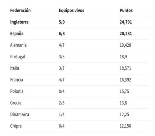 目前,英超和英格蘭牢牢占據(jù)著第一把交椅,那個(gè)額外的名額他們基本穩(wěn)了。現(xiàn)在真正的爭(zhēng)奪戰(zhàn)是在西班牙和德國(guó)之間展開,雙方都在為第五個(gè)歐冠名額拼得你死我活。