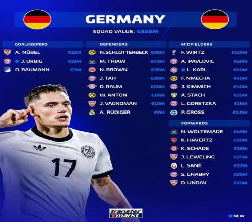 新一期德國隊身價榜:維爾茨1.1億第1,沃爾特馬德6500萬第2