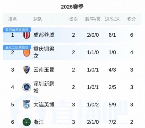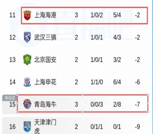 中超積分榜更新!海港3輪2負天崩開局,浙江3輪不敗積2分轉正成功