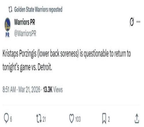 勇士隊巴特勒報銷,庫里、塞斯庫里、波斯特、穆迪、霍福德悉數(shù)因傷缺席,同時波神在出戰(zhàn)半場后傷退,勇士官方給出的原因是下背部酸痛。