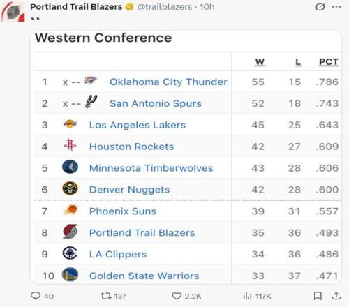 開拓者拿到三連勝,而快船吞下4連敗,勇士隊最近的21場比賽輸?shù)袅?6場,開拓者已經(jīng)反超快船升至西部第八,開拓者已經(jīng)領(lǐng)先勇士1.5個勝場,開拓者近來狀態(tài)真的不錯。