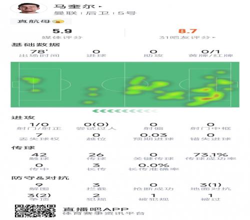 馬奎爾本場數(shù)據(jù):送點(diǎn)+染紅,9次解圍,3次攔截,評分5.9分