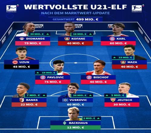 德甲身價最高U21陣容:卡爾、帕夫洛維奇、武什科維奇、烏尊在列