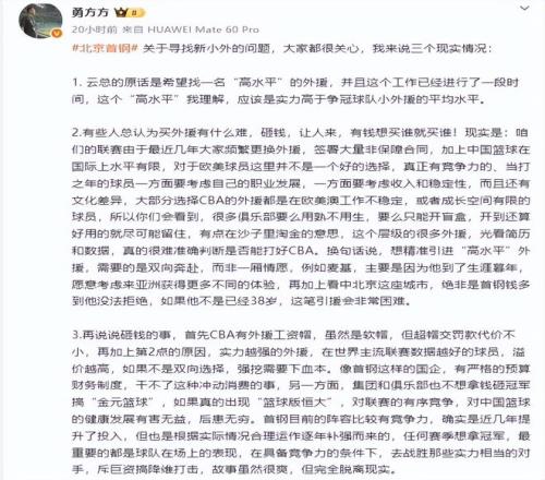 北京男籃尋找新小外援的事情是很多球迷關(guān)注的焦點(diǎn),北京記者勇方方發(fā)文談到了這件事的相關(guān)情況。勇方方表示,北京男籃的確想要一名“高水平”的小外援,但操作起來的難度非常大,并不是砸錢就能解決的。而且北京男籃管理層也并不想搞“金元籃球”,這對(duì)CBA和中國(guó)籃球的發(fā)展都是有害無(wú)益、后患無(wú)窮。北京男籃這幾年的確逐步增大了投入,但也是根據(jù)實(shí)際情況合理運(yùn)作逐年補(bǔ)強(qiáng)而來的。