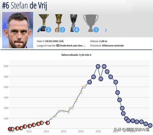 舉個(gè)例子:國(guó)米后衛(wèi)德弗賴,2020年時(shí)他的身價(jià)達(dá)到生涯巔峰的6000萬歐元,在短短4-5年內(nèi),他的身價(jià)就下滑到了500萬歐元(如今只有350萬)。這固然與他在俱樂部,國(guó)家隊(duì)的地位下滑有關(guān),但根本的原因還是隨著年紀(jì)的不斷提升,他的身價(jià)每次更新都會(huì)下降——即便球員表現(xiàn)好的時(shí)候,也只是降的慢一點(diǎn)而已,趨勢(shì)是不會(huì)變的。