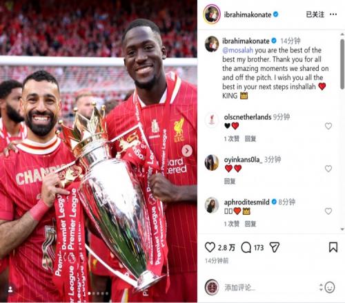 體育播報(bào)3月25日宣 薩拉赫本賽季結(jié)束后離開利物浦,隊(duì)友科納特社媒發(fā)文致敬。