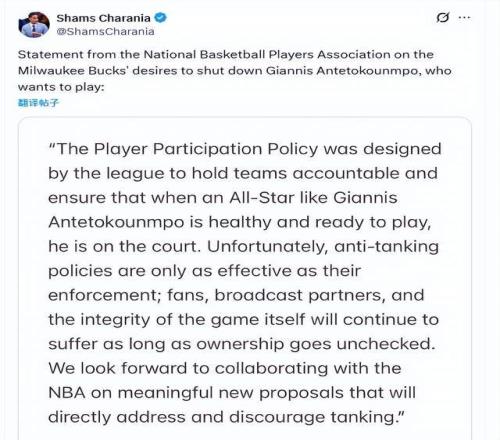 球員工會(huì)在周三的聲明中援引了NBA的反擺爛條例,并明確表示字母哥身體健康、具備出戰(zhàn)條件。