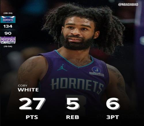 此役黃蜂全隊5人上雙+兩人20+,拉梅洛-鮑爾16中7+三分13中6拿到20分8助攻6籃板2搶斷;科比-懷特全場比賽18分鐘,12中9,三分8中6,罰球3中3,拿到27分5籃板1助攻0失誤,命中率75%,三分命中率75%,真實命中率101.4%,正負值+26。