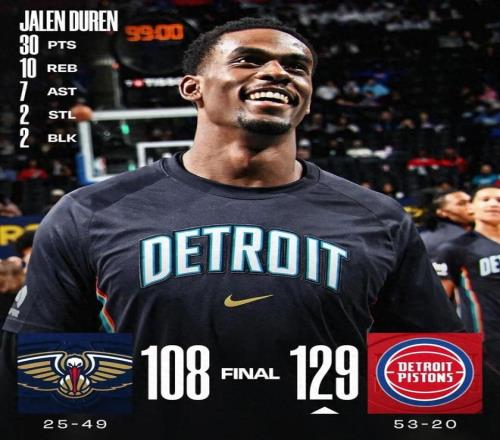 今日常規(guī)賽,活塞對陣鵜鶘,129-108輕松拿下比賽。
