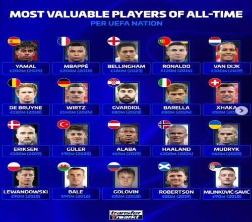 體育播報3月29日宣 德國轉(zhuǎn)會市場盤點了歐足聯(lián)旗下各隊歷史身價最高球員,亞馬爾、哈蘭德和姆巴佩2億歐并列榜首,C羅最高1.2億歐。