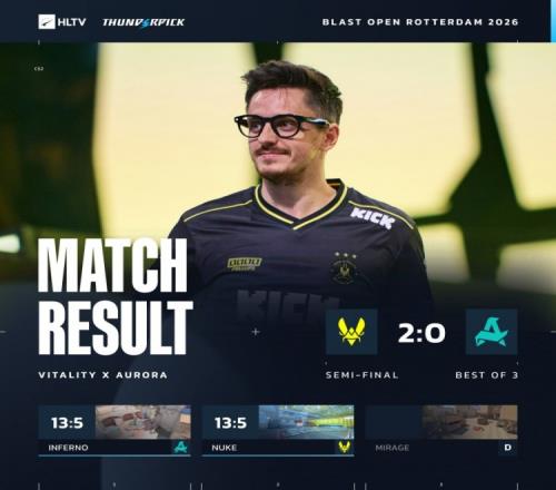 體育播報3月28日宣 CS2大賽BLAST鹿特丹首場半決賽,Vitality輕松兩個13-5橫掃Aurora,晉級決賽!