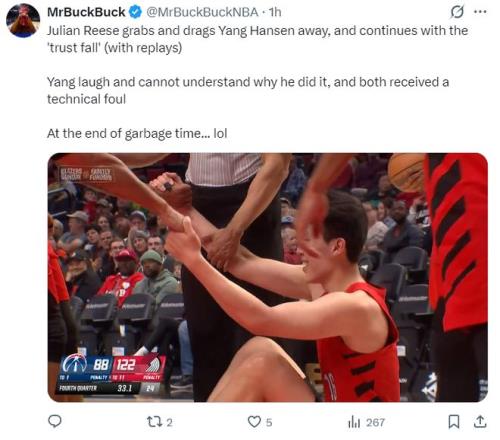 美媒也為楊瀚森抱不平:在比賽垃圾時(shí)間,朱利安-里斯從身后抓住楊瀚森將他拖走,然后進(jìn)行了‘信任墜落’(抱摔),楊瀚森哈哈大笑不明白里斯為何這樣做,裁判在看了回放的情況下給了兩人技術(shù)犯規(guī)。
